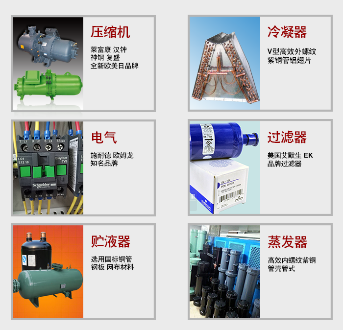 采用意大利萊富康、德國比澤爾、中國臺灣復(fù)盛、漢鐘半封閉螺桿壓縮機(jī)。